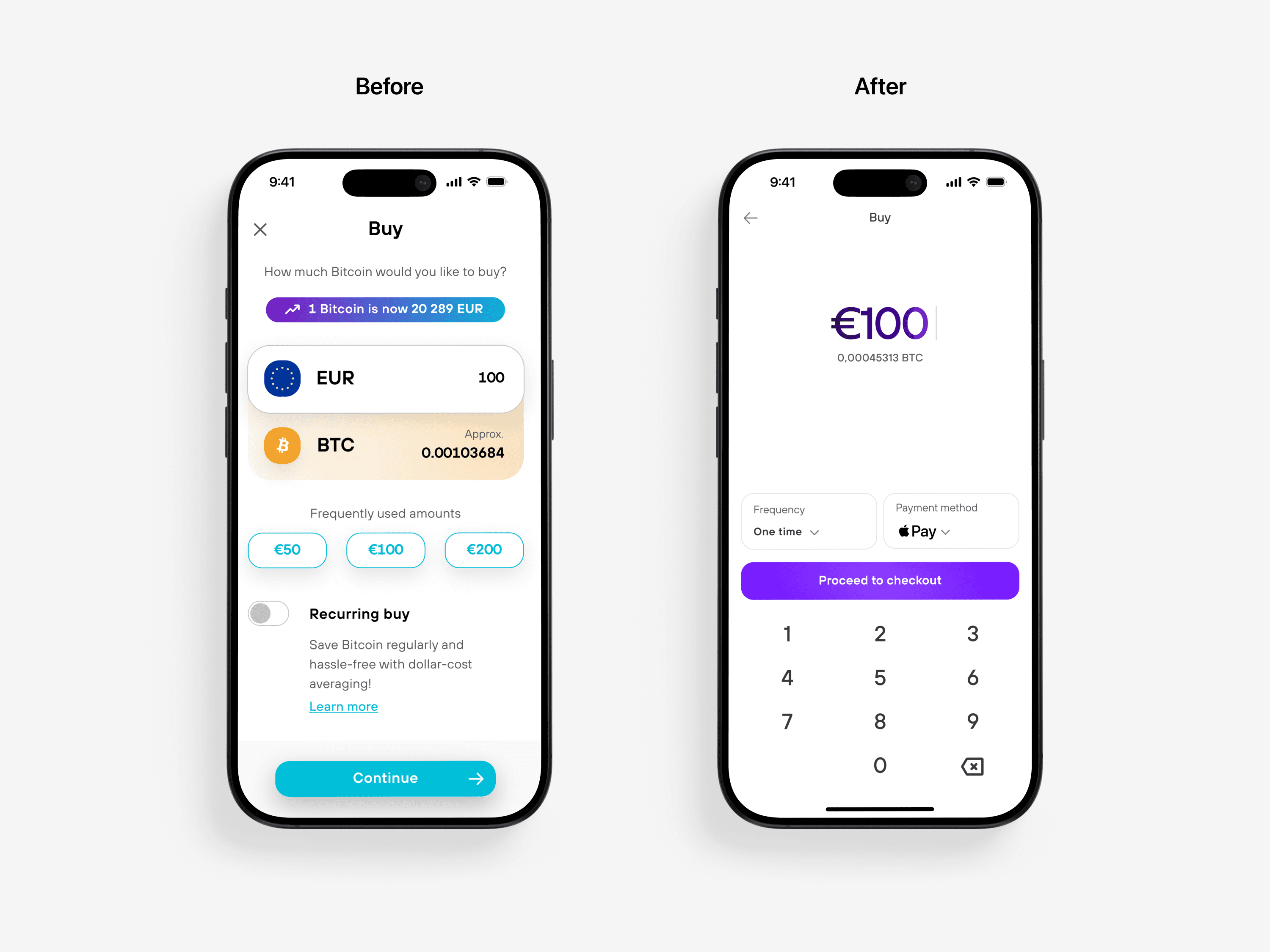 The Solution: We streamlined the flow to 2 screens and implemented Smart Defaults (pre-selected recurring freqency, amount and payment method).